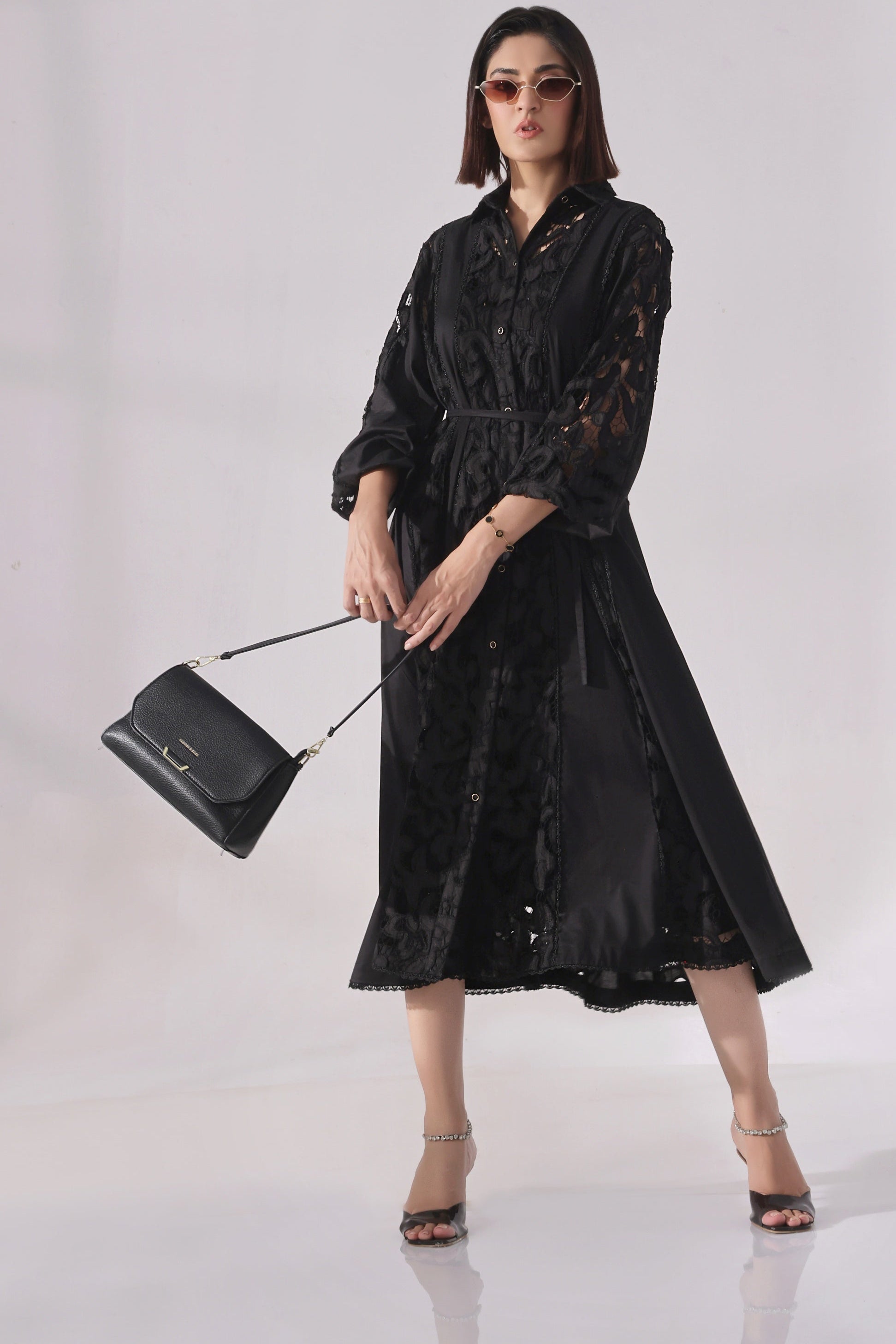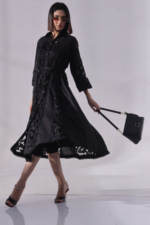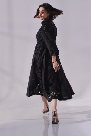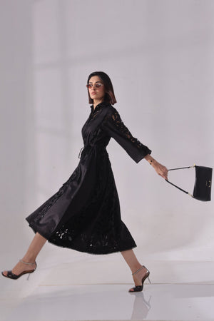 Elevate your evening or festive wardrobe with this elegant long black dress featuring a striking mix of textures and intricate detailing. The dress showcases a cutwork fabric panel that runs along the front or sides (placement customizable), adding a touch of artisanal craftsmanship. Delicate lace accents at the neckline, cuffs, or hem infuse feminine charm, while button embellishments provide a vintage-inspired touch.