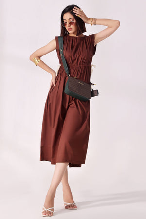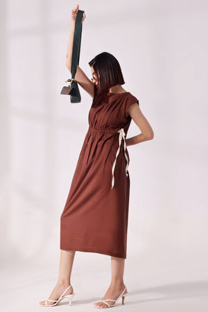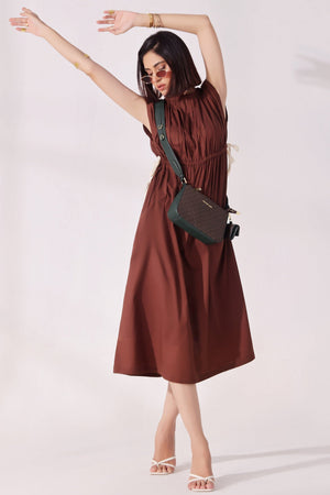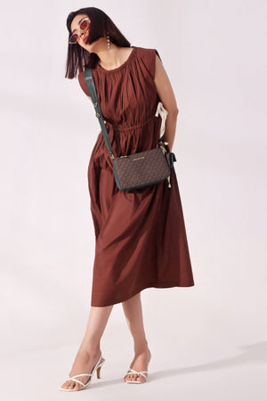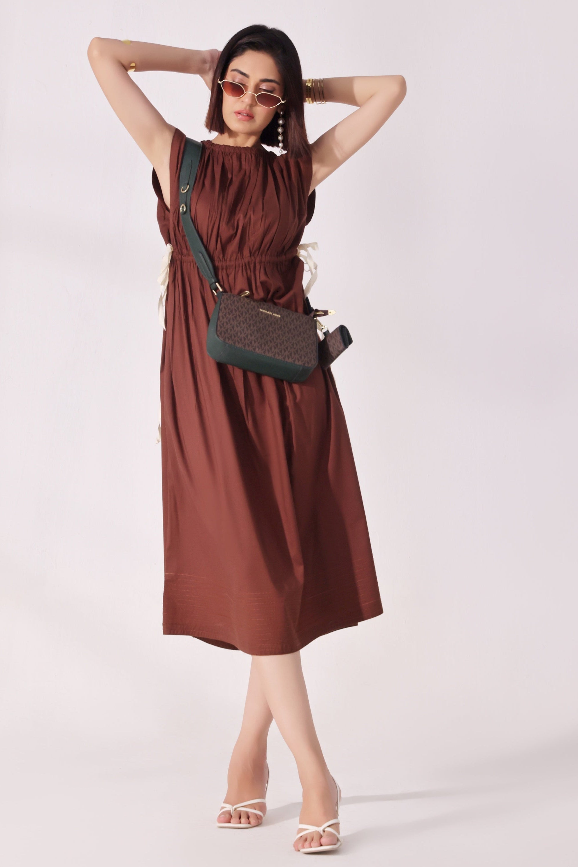 Dress: Sleeveless midi dress in rich chocolate brown with thread detailing on the armholes and bottom hem
