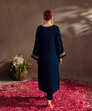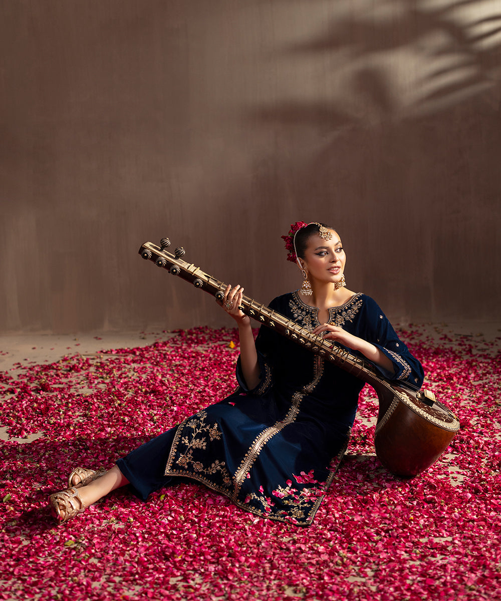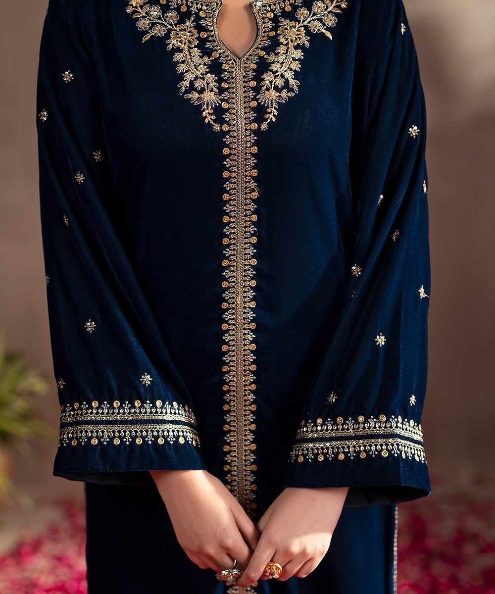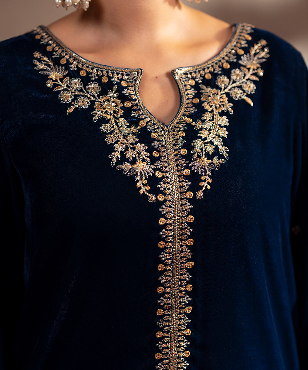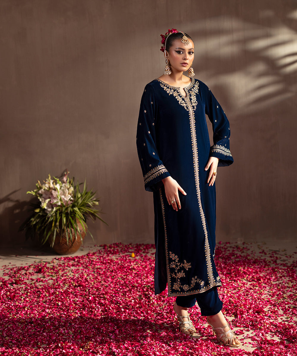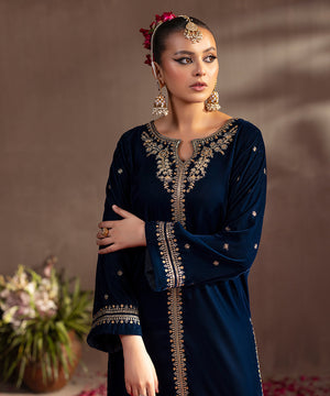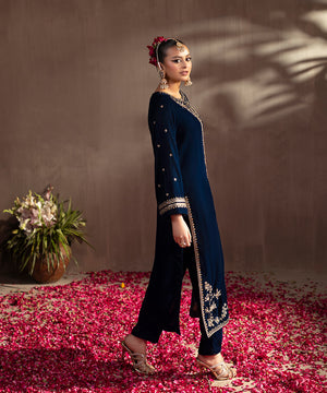 Description: This one piece teal velvet ensemble exudes timeless elegance with its luxurious texture and refined detailing. Designed in a long front-open style, it features exquisite golden tilla and sequin embroidery that shimmers beautifully against the rich teal base. The keyhole neckline adds a touch of sophistication, while the loose sleeves lend a graceful, flowing silhouette, perfect for festive and evening occasions.