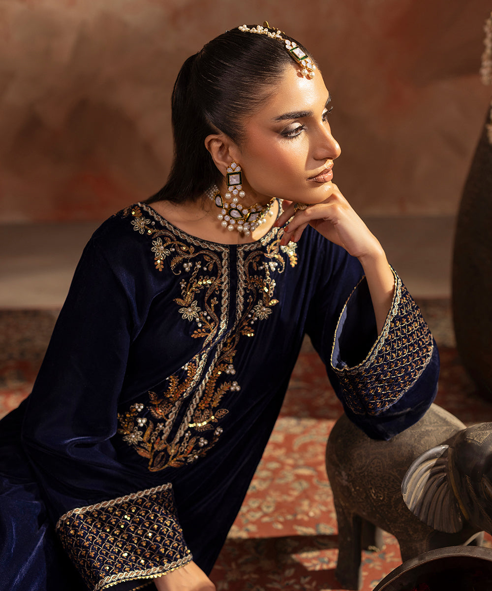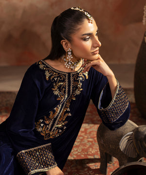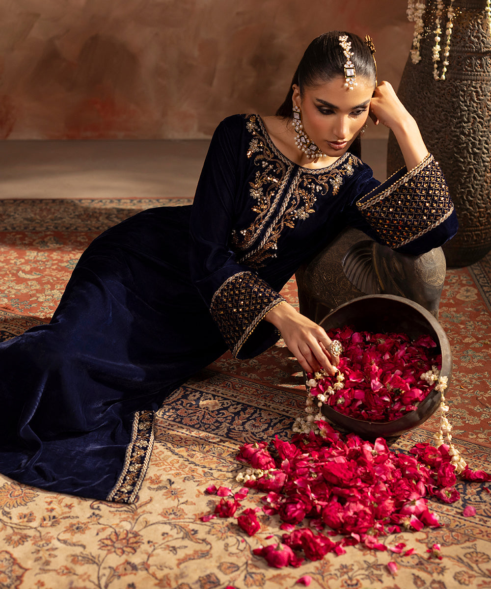 Description: One piece velvet article in a deep navy blue shade, featuring exquisite antique gold and bronze embroidery. The neckline is richly adorned with intricate floral motifs and delicate bead accents that extend gracefully down the front. The wide sleeves showcase heavily embroidered geometric patterns with ornate cuffs, adding a statement touch. Side borders are detailed with matching embroidery, completing the luxurious look.