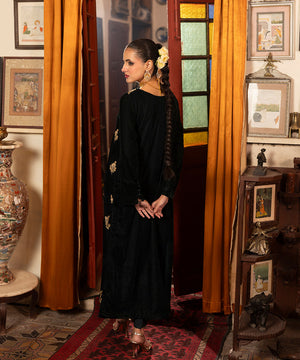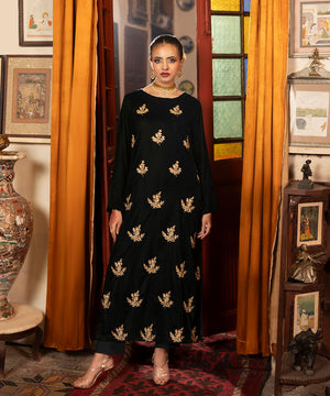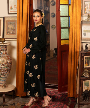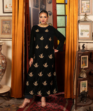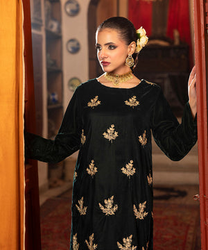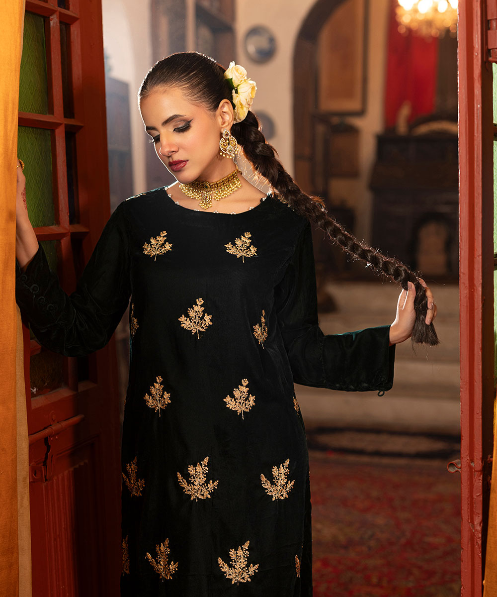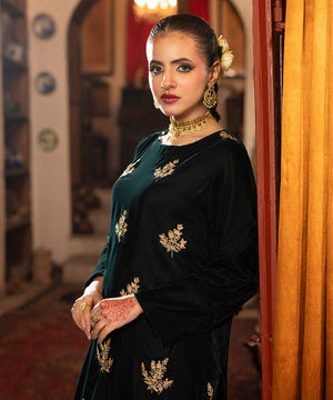 Description: This one piece velvet article in a classic bottle green shade features an all-over floral embroidery spray crafted in rich golden tones. The intricate gold threadwork adds a luxurious sheen and festive charm, beautifully complementing the deep velvet base for an elegant and timeless look.