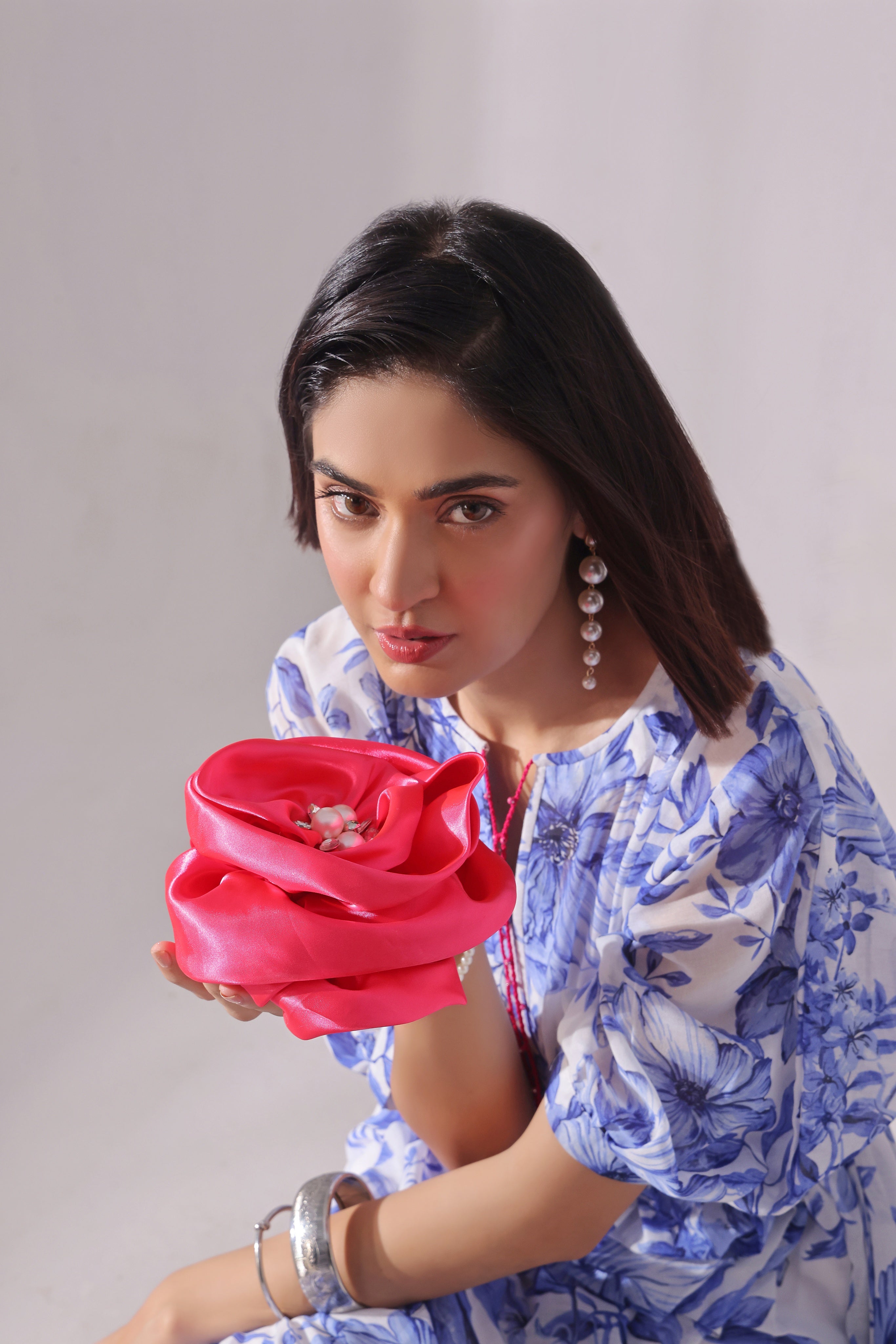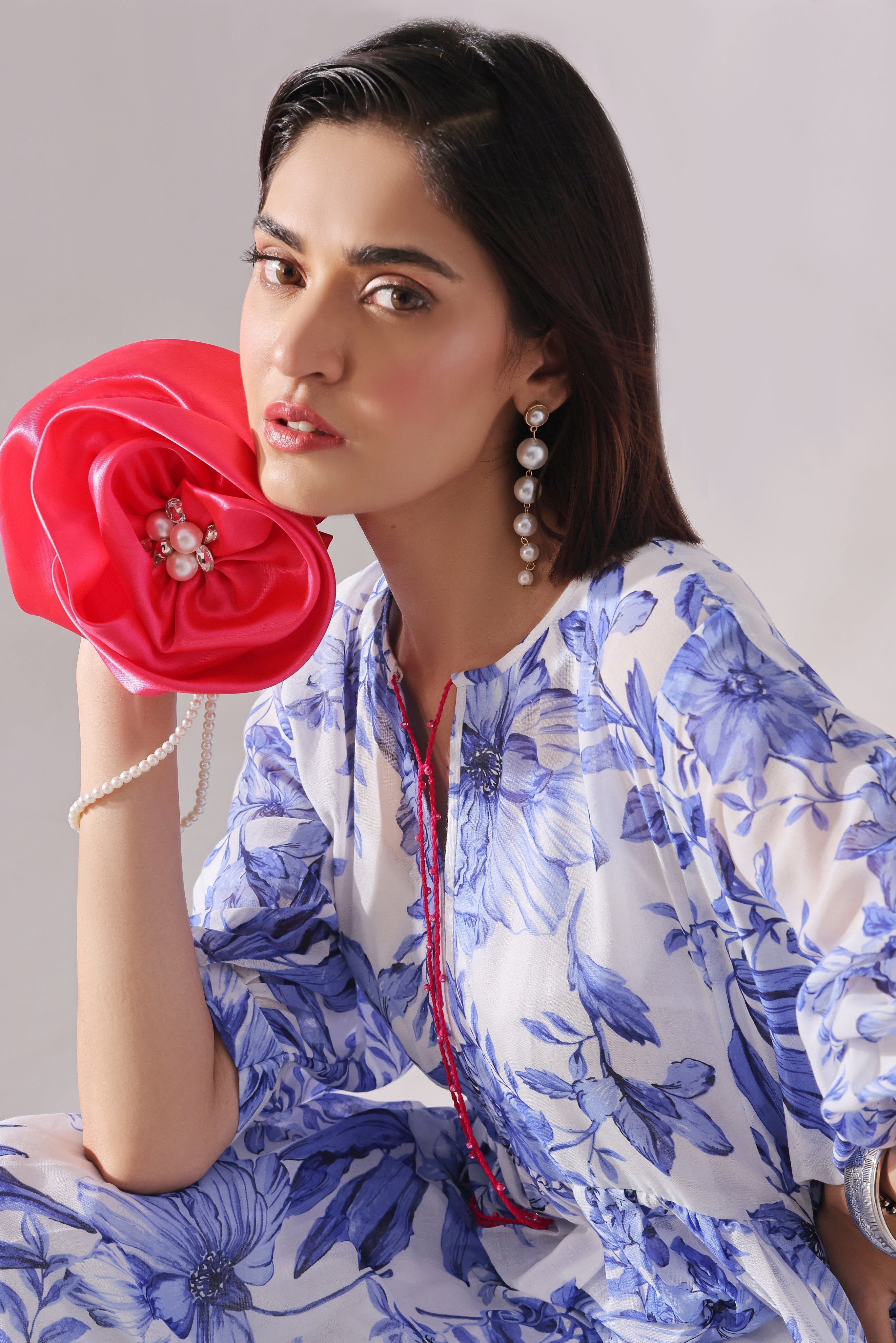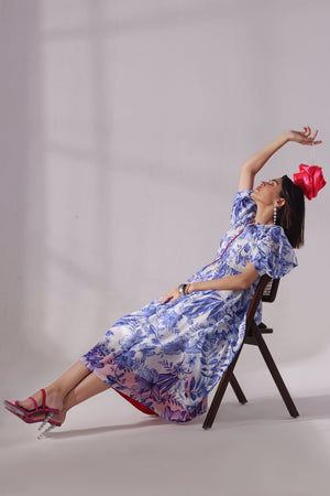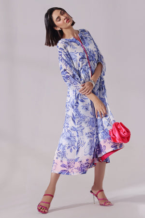 Fresh, feminine, and effortlessly stylish — this Blue & White Floral Print Midi Dress is your go-to choice for elevated daywear. Designed in a breezy A-line silhouette, it features a soft blue botanical print on a crisp white base, finished with a delicate pink gradient hem that adds a playful pop of color. The relaxed fit, gathered waistline, and elbow-length sleeves ensure all-day comfort without compromising on style.