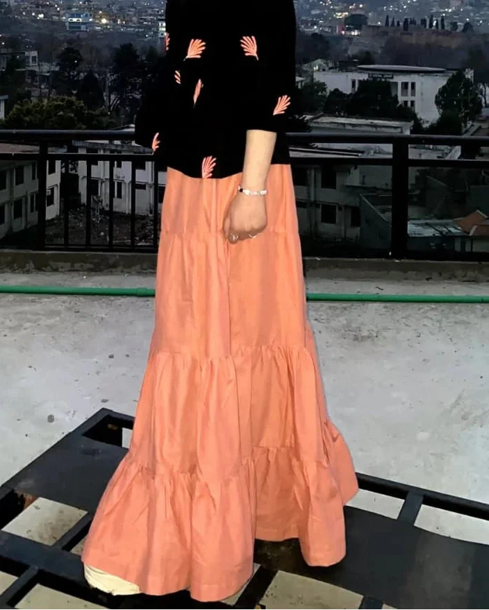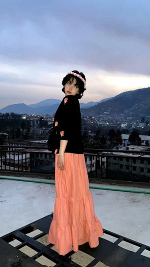 A flowy peach cotton skirt with a tiered design, crafted for comfort and effortless elegance. Easy to pair with fusion and casual tops.