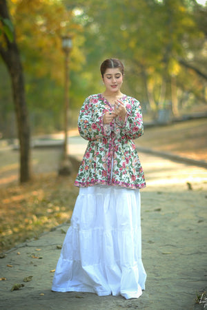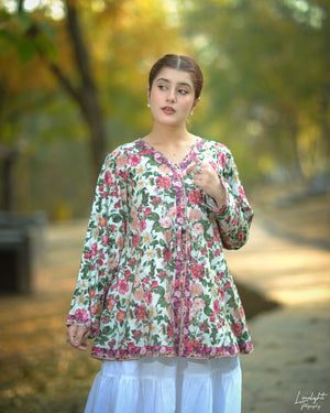 Description: A short printed kurti crafted from breathable cotton fabric, featuring an all-over floral print with contrast neckline and front placket detailing. Designed for everyday comfort with a soft, graceful look.