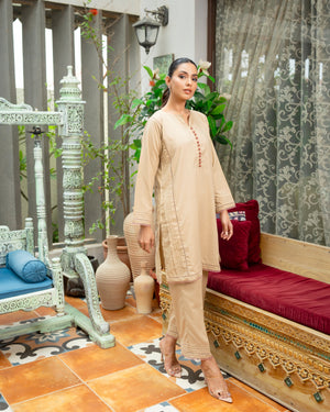 Ahed - symbolizing a promise, this solid beige two-piece set embodies commitment and sincerity with its elegant button, lace, and pleat detailing. Crafted from Italian blended fabric, it reflects the dedication embedded in personal bonds and pledges.