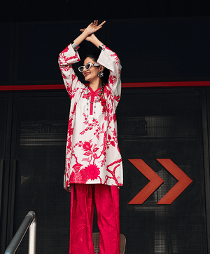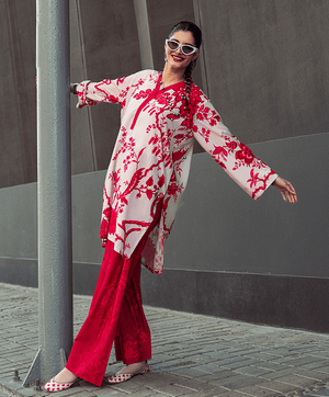 Celebrate the delicate charm of Cherry Blossom set. It features a printed tunic with bold red floral patterns, paired with printed red trousers. The contrast of pink and white creates a striking and vibrant look, complemented by stylish accessories. Designed for casual occasions.