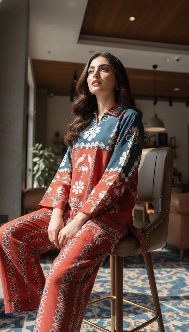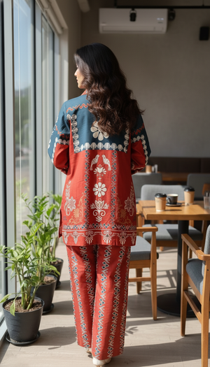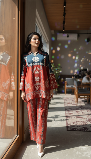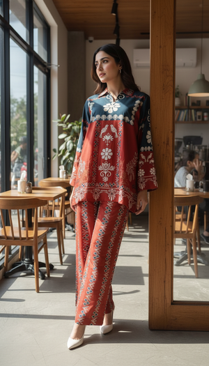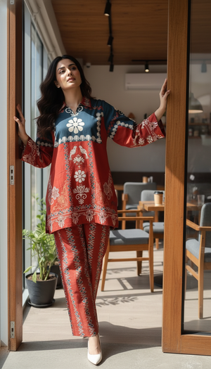 Elevate your everyday style with this stunning rust and green printed co-ord set, blending traditional motifs with a modern silhouette. Crafted from lightweight, breathable fabric, this two-piece ensemble features a relaxed-fit shirt with a collared neckline and full sleeves, adorned with intricate floral and geometric patterns. The matching straight-cut trousers carry the same vibrant detailing for a cohesive, effortlessly chic look.