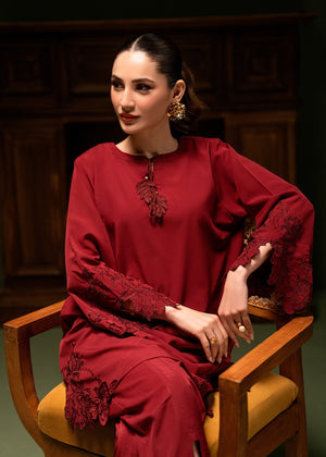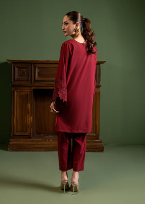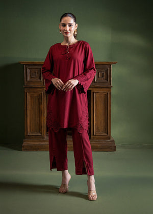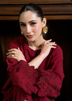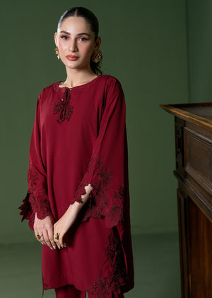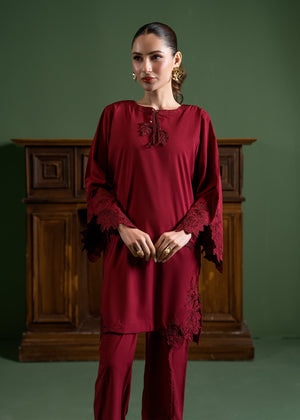 Captivate in this rich maroon ensemble, adorned with intricate floral embroided cutwork on the statement sleeves and hem for a romantic touch. The relaxed silhouette and delicate neckline tassel detailing make this bold set an ideal choice for elevated evening wear or festive gatherings.