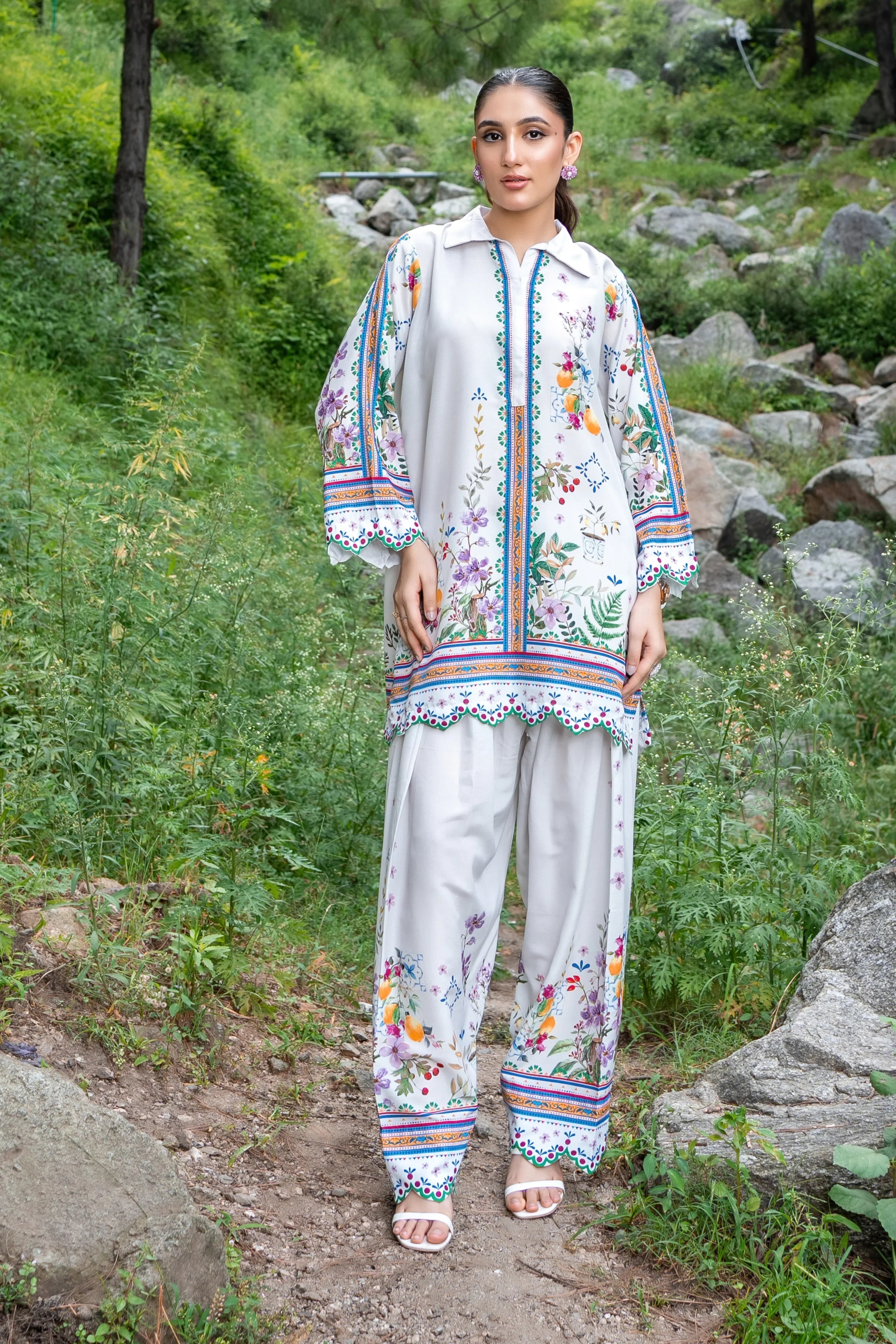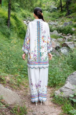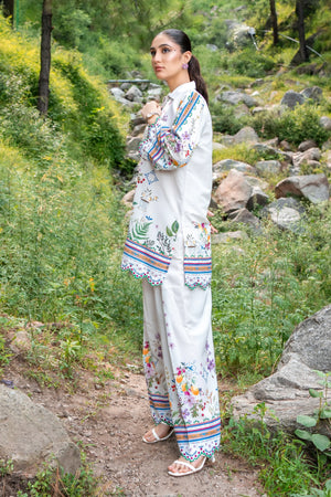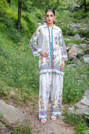 A beautifully printed two-piece featuring intricate floral patterns and a relaxed silhouette. The straight-cut shirt and matching farshi shalwar offer effortless elegance, perfect for both casual outings and semi-formal occasions.