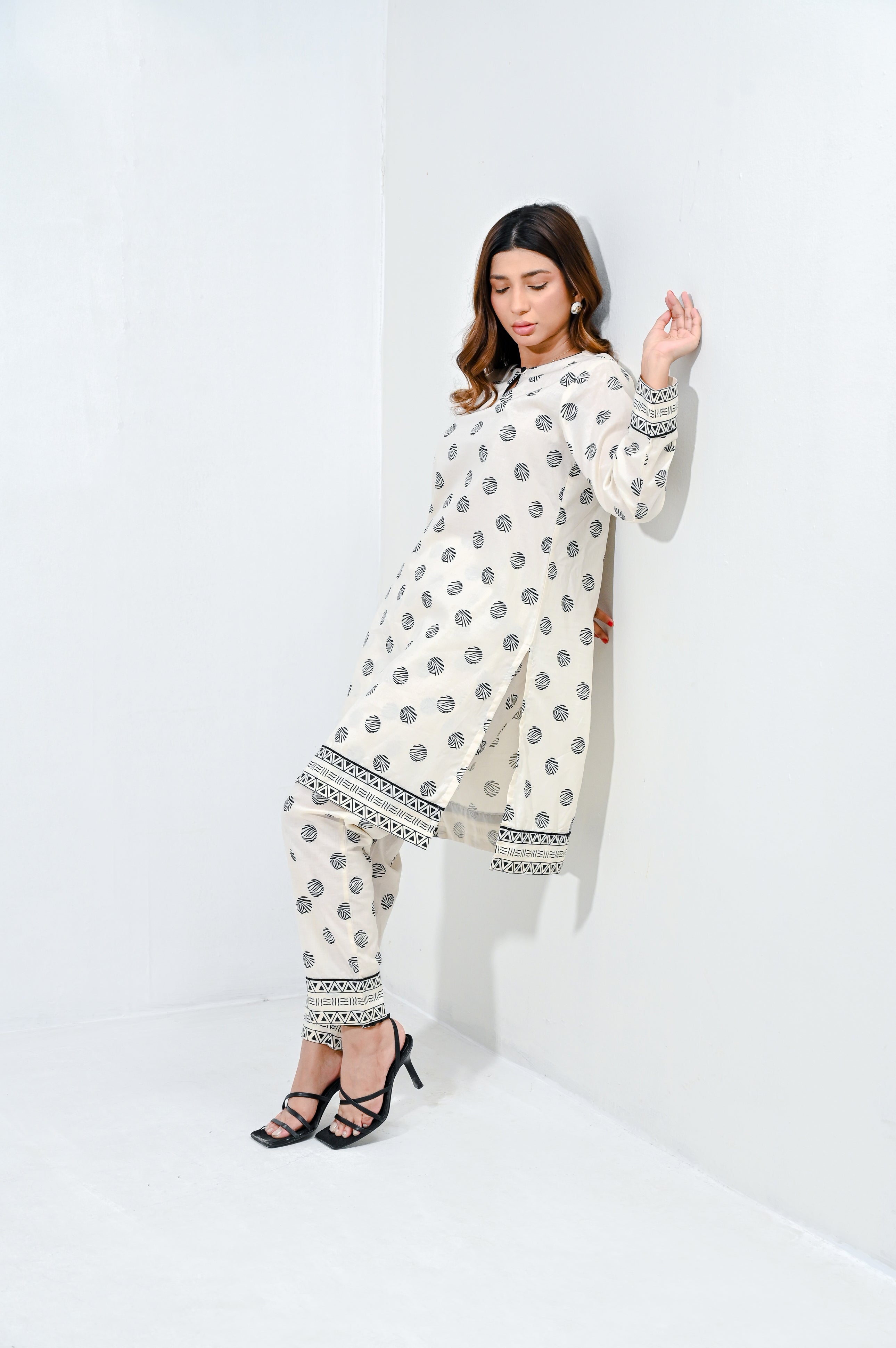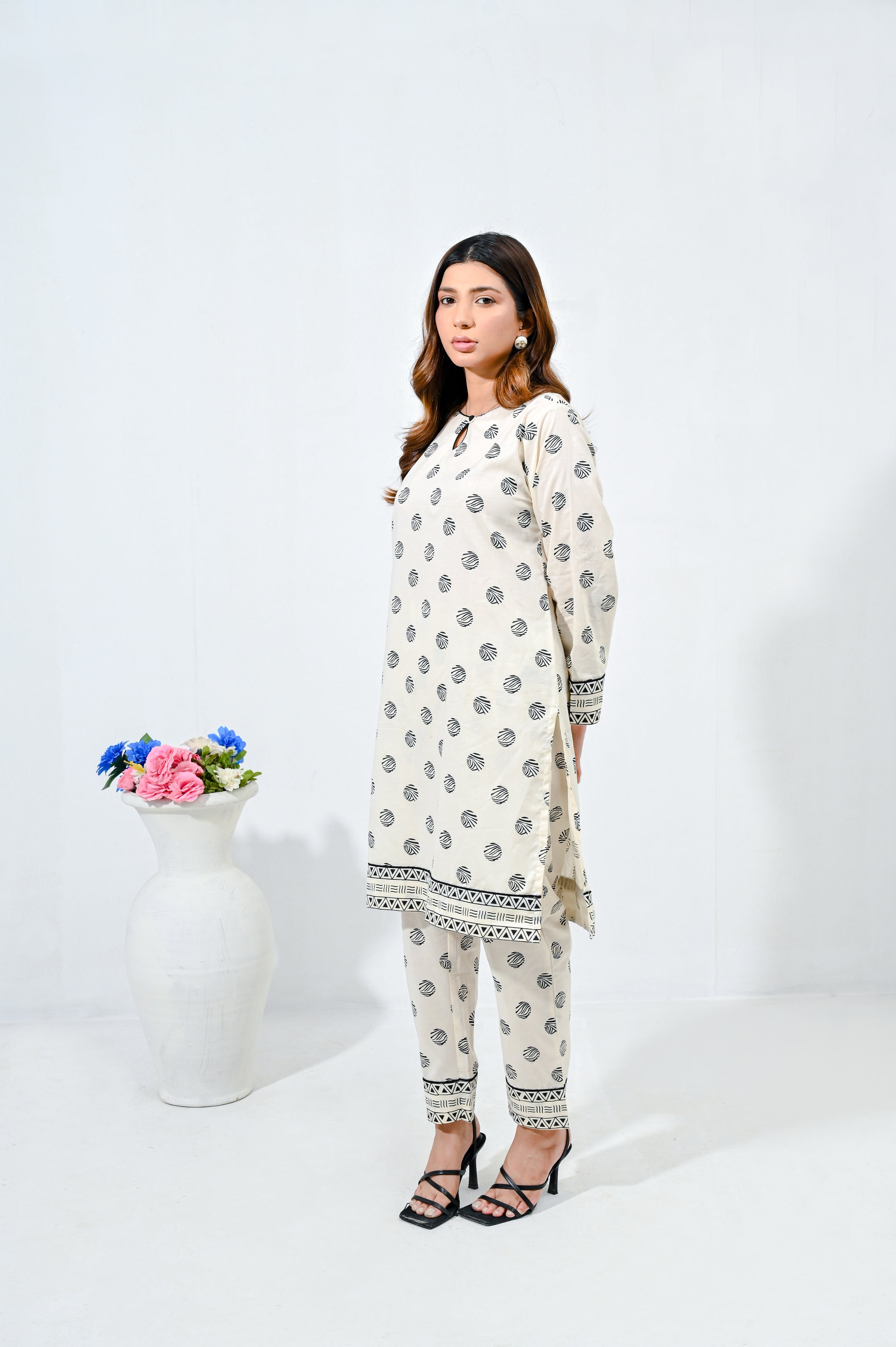Embrace effortless chic with this stunning white cambric screen printed shirt and matching printed straight pants coord set. The shirt boasts delicate prints that add a touch of sophistication, while the straight pants offer a contemporary silhouette for a flattering fit. This versatile ensemble can be dressed up with heels or kept laid-back with flats.Â