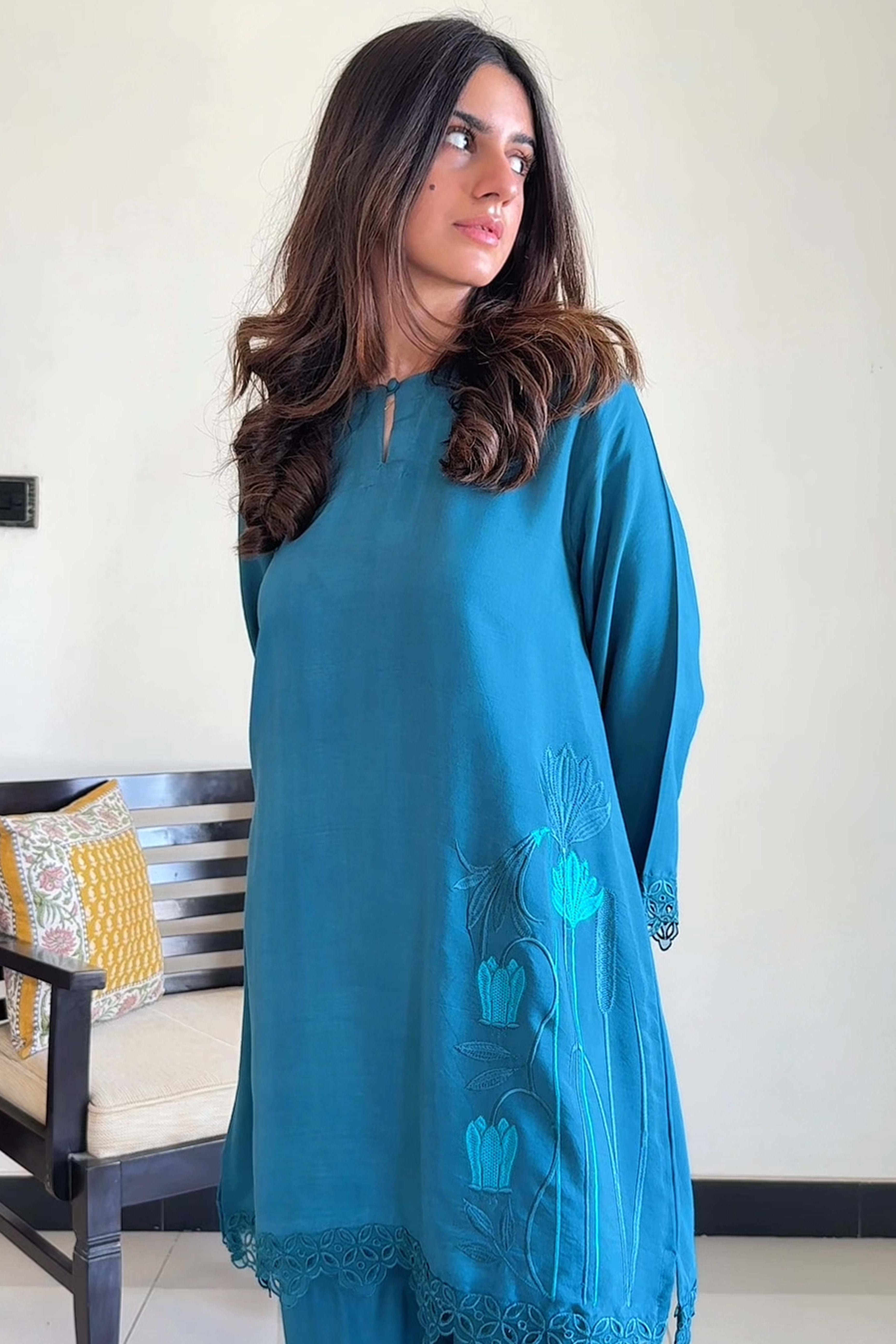 Refined and graceful, this 2-piece teal ensemble in premium silk lawn is a perfect blend of tradition and contemporary charm.