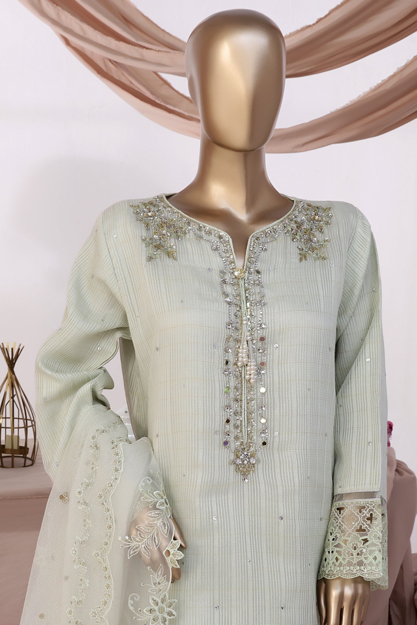 - Dobby Organza Embroidered Shirt ??heavy handwork on the neckline; highlights of cutwork And stitching details.