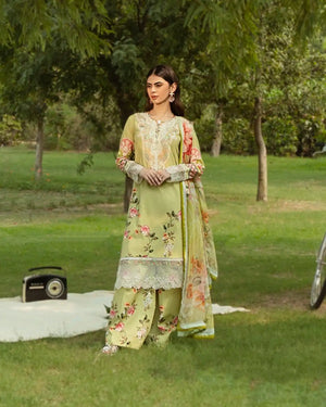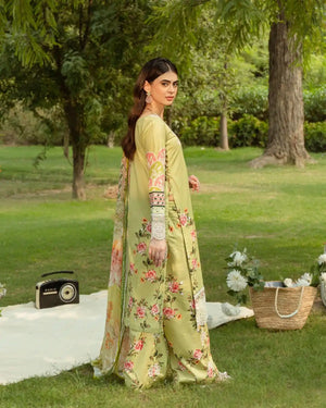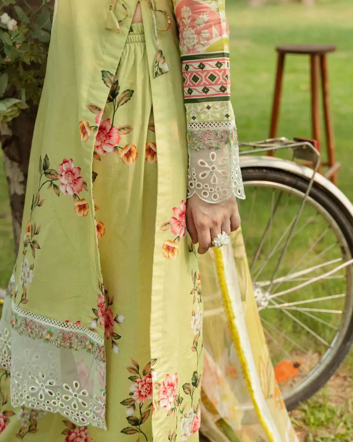 The Camellia Dress features a light green base with intricate embroidery and floral patterns. White patch detailing on the neckline and cuffs adds elegance, while long sleeves and wide-leg pants offer a graceful silhouette. Paired with a matching printed dupatta, this lawn and silk outfit is perfect for warm-weather sophistication.