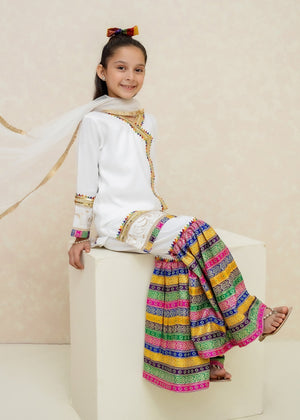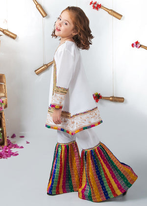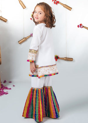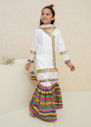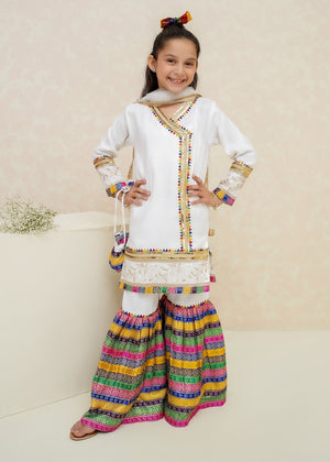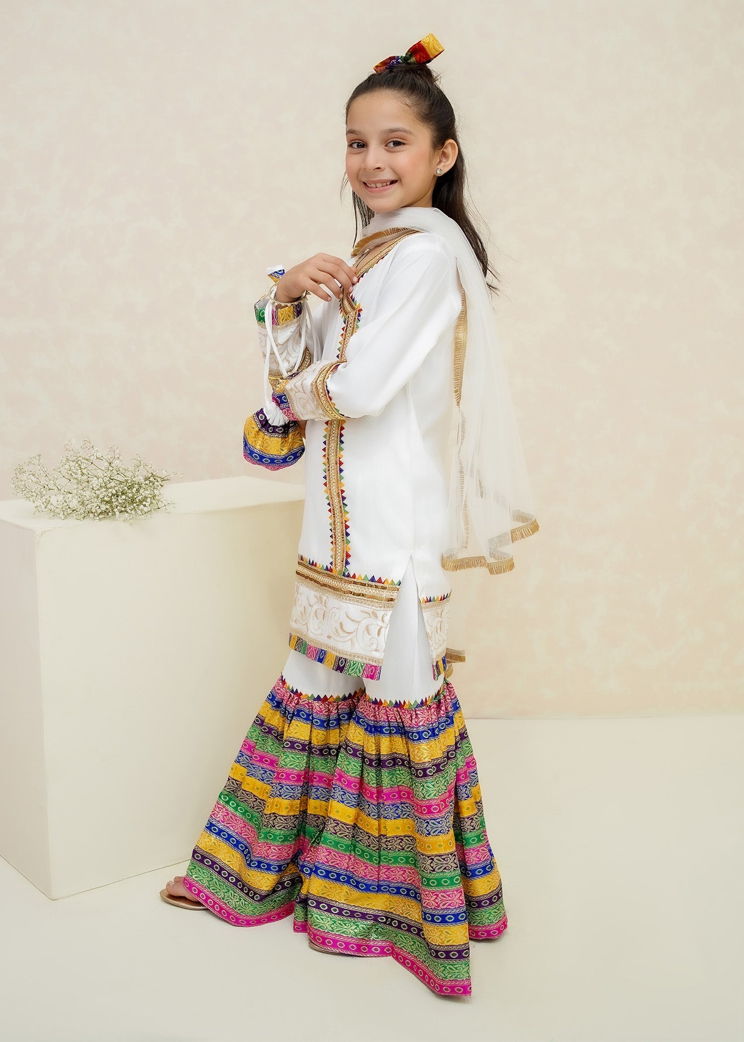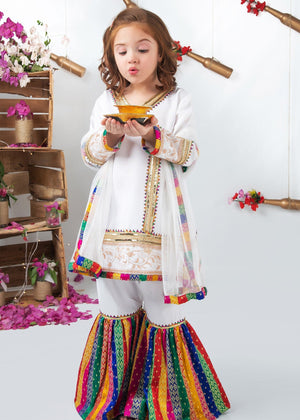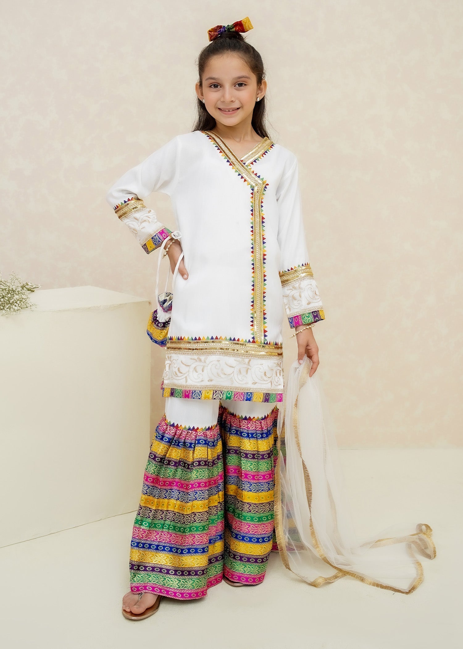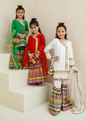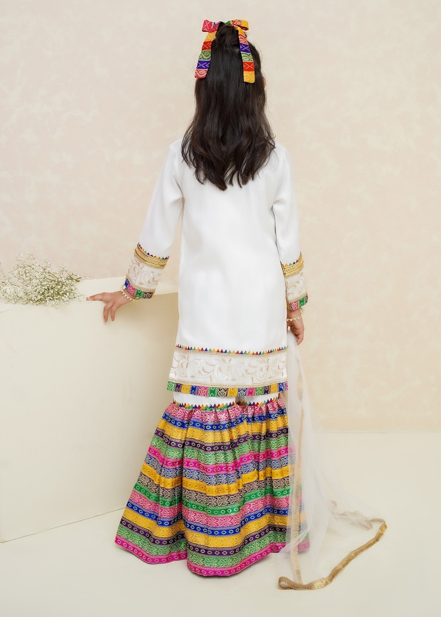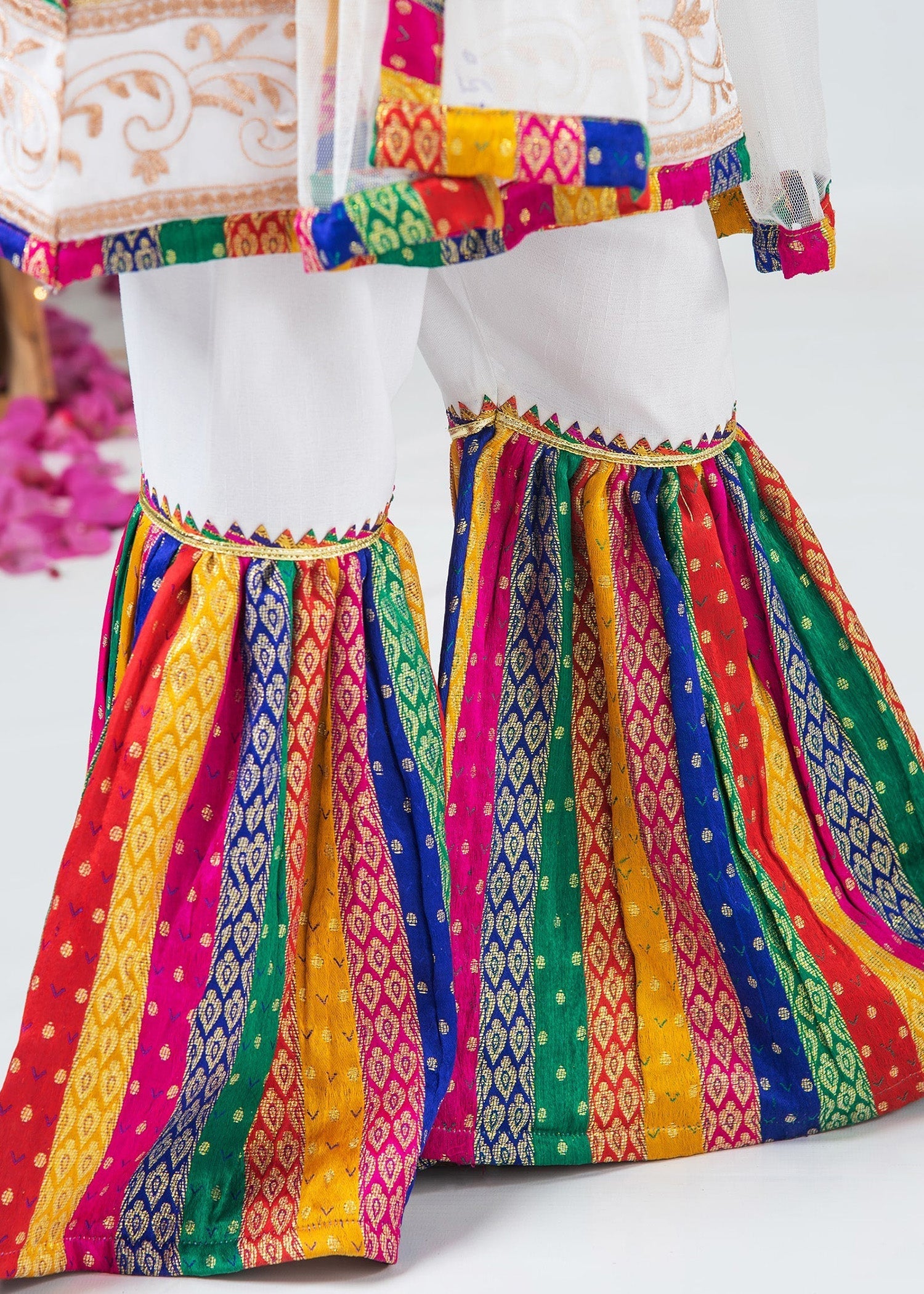 - Detailing: Angrakha style kurti embellished with gota lace all over completed with gorgeous border paired with jamawar gharara and net dupatta.