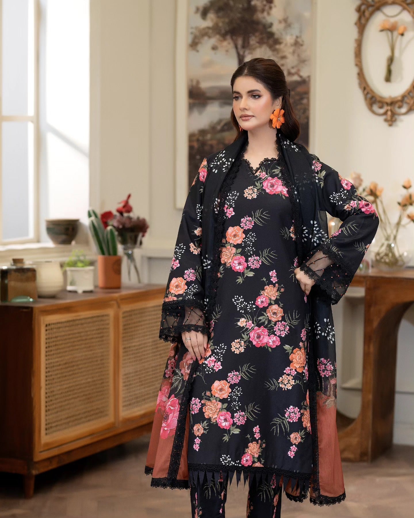 Elevate your style with this stunning black, long-sleeved garment featuring a beautiful floral pattern. The elegant design adds a touch of timeless femininity, perfect for classic styles that never go out of fashion. With its sophisticated silhouette, this dress exudes style and refinement, ensuring you make a lasting impression wherever you go.