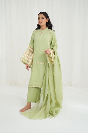 This elegantly crafted pistachio loose-fit kurta features contemporary stacked borders on the sleeves. Paired with straight pants and a coordinating pistachio cotton net slub dupatta, it offers a refined yet understated look, making it the perfect choice for those seeking a blend of richness and subtlety.