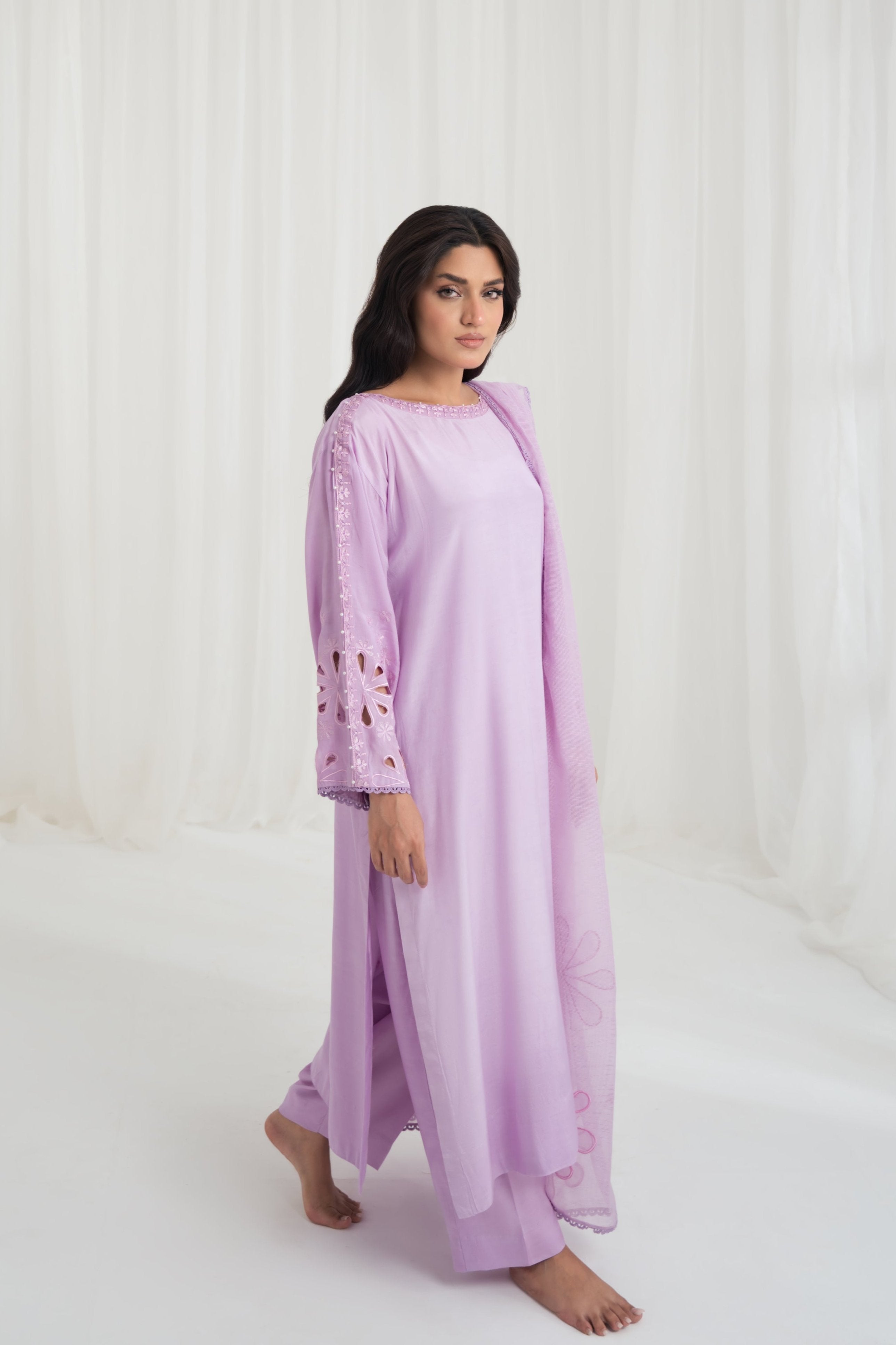 The lilac co-ord set is a visual treat, combining exquisite cutwork and embroidery on the sleeves, adorned with pearls. It is complemented by straight pants and an embroidered cotton net slub dupatta.