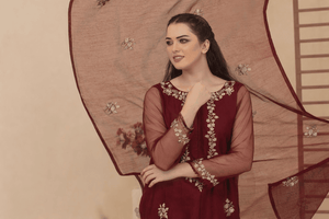 Elevate your festive and semi-formal wardrobe with this graceful maroon embroidered suit. Crafted with a rich chiffon base, the outfit features delicate gold embroidery on the neckline, sleeves, and hem, creating a timeless and elegant look. The sheer chiffon dupatta adds a soft, flowing finish, perfectly complementing the straight-cut kameez and matching trousers. Ideal for festive gatherings, evening wear, and special occasions, this ensemble blends sophistication with comfort.