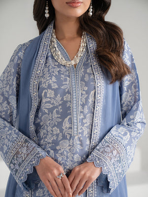 A refreshing blue printed lawn ensemble featuring a beautifully designed shirt and matching trouser. Paired with a lightweight chiffon dupatta that adds a soft, graceful finish. Perfect for effortless everyday elegance.