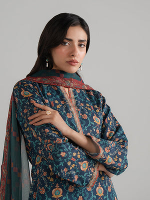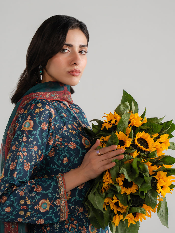 Elevate your everyday style with this beautifully printed Teal lawn shirt and trouser set. The breathable lawn fabric ensures all-day comfort, while the intricate print adds a refined visual appeal. Finished with a graceful chiffon dupatta, this ensemble is ideal for both casual gatherings and daytime outings.