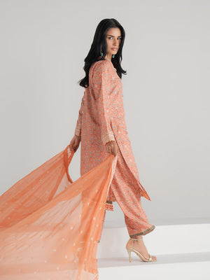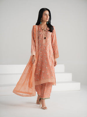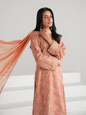 Embrace summer in style with this peach printed lawn ensemble. Made from breathable lawn fabric and adorned with a graceful print, it offers the perfect balance of comfort and elegance for everyday wear.