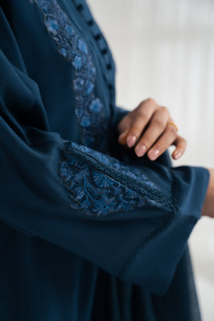 The contemporary blue silk shirt features exquisite embroidered borders and intricate motif details on the sleeves. Paired with embroidered straight pants and a scalloped cotton net slub dupatta, this ensemble is the perfect choice for upcoming occasions when you want to make a statement.