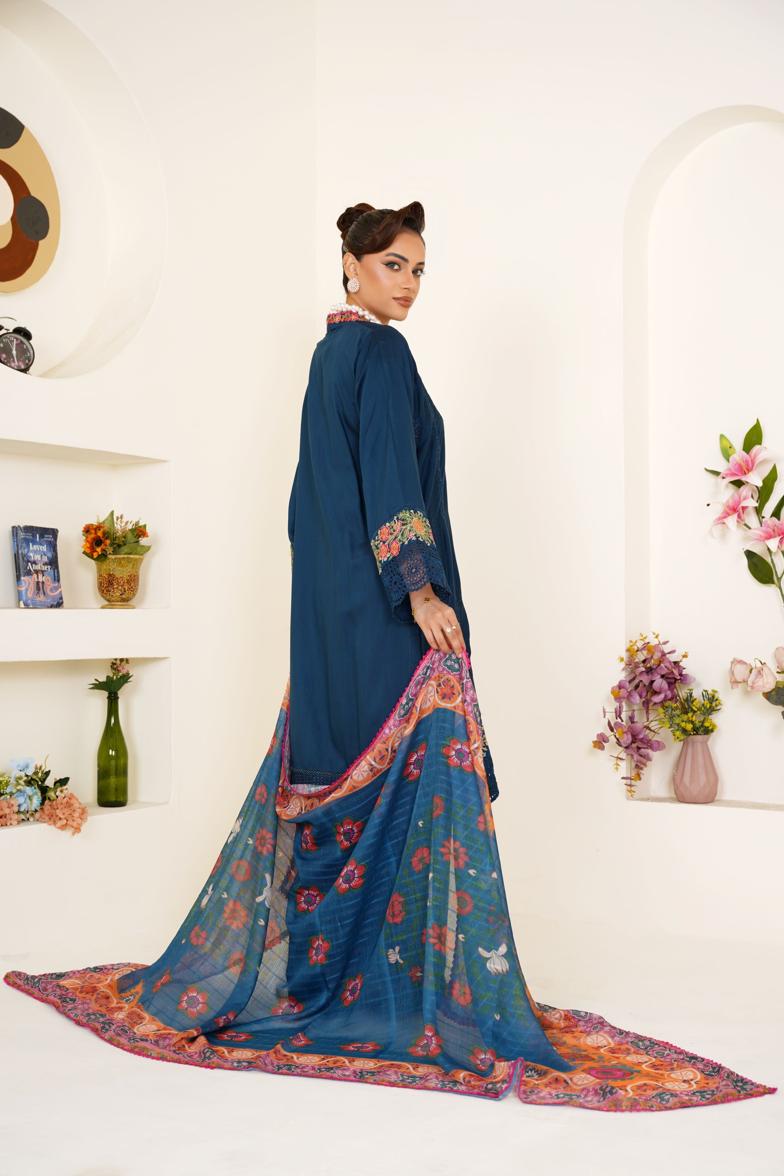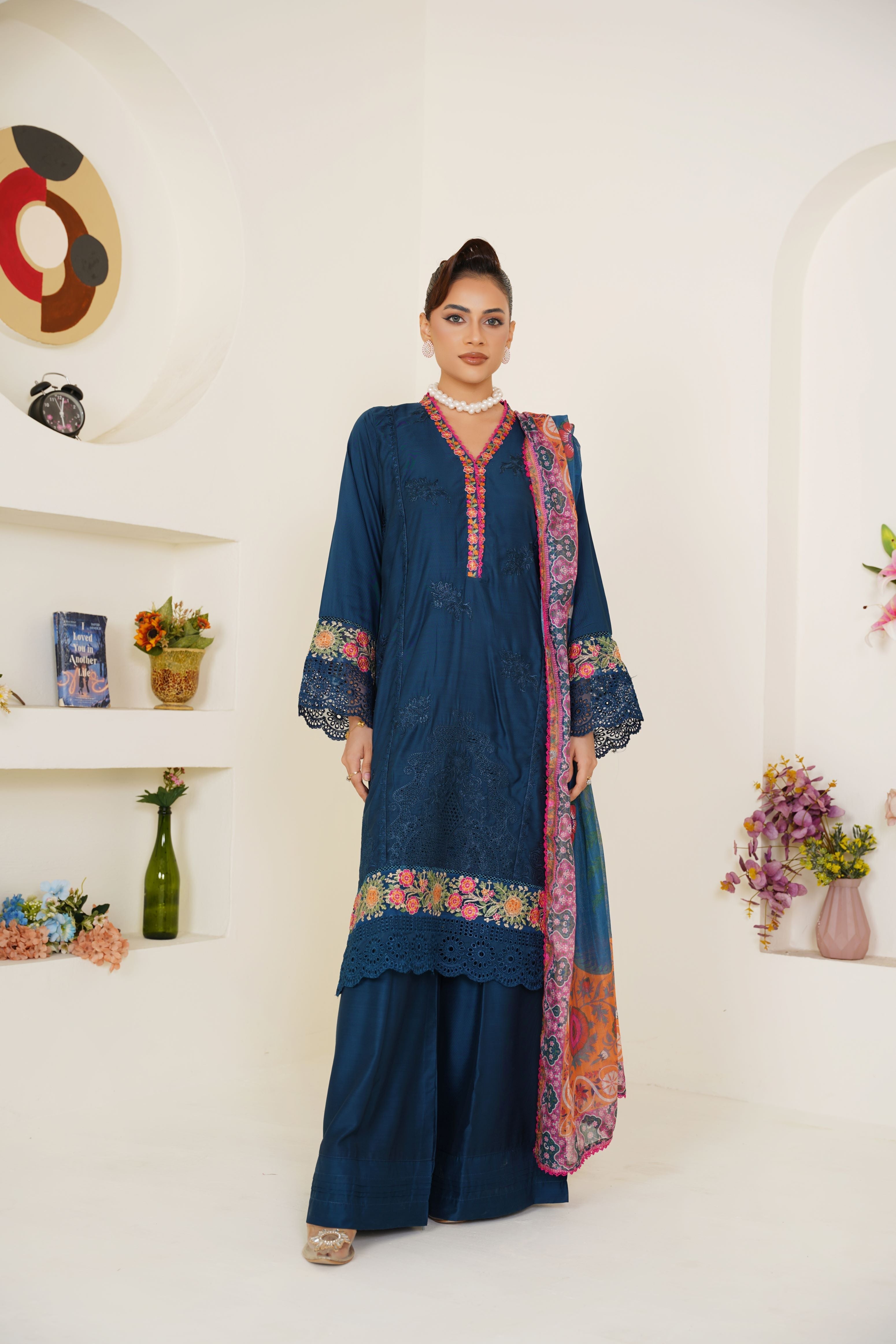 ·       Embroidery: Multicolor thread floral detailing & cutwork borders