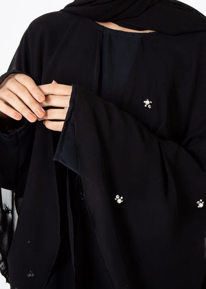 Product Description:Â This modest Azekeh abaya features chiffon bask on its shoulder with shiny pearls and sequence work.