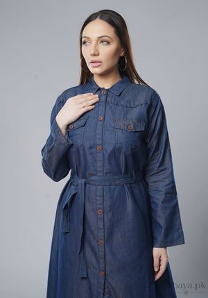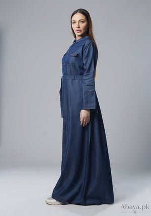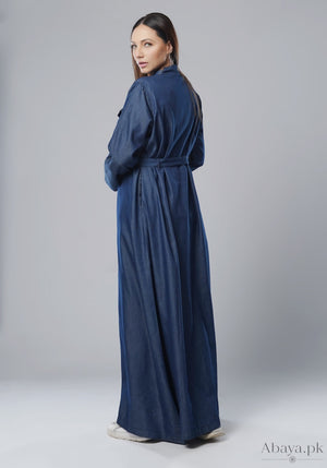 Product Description:Â The simple yet astonishing drape style with belted front, Denim Hale Abaya is a fine addition to your appearance that commemorates your look. A must-have for your day-to-day use!