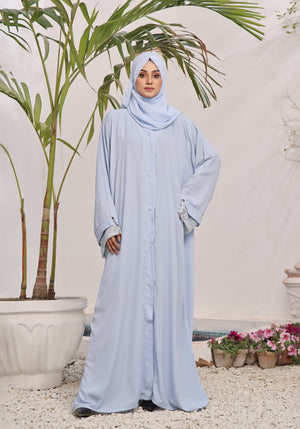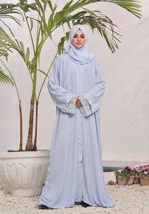 Product Description:Â Our light blue abaya radiates a soft look with the same color hijab. The sleeves have been finished with overlap net to give it a stylish look.