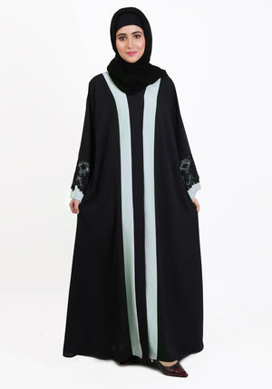 Product Description: The magnificent Marisa abaya made from top quality Nida fabric brings the style into a Front-open design with Bell lace sleeves. The Sage Green color panels adds elegance that is perfect for an everyday look.