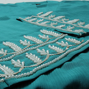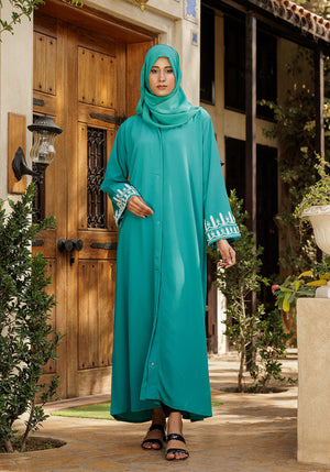 Step into timeless elegance with our Sea Green Embroidered Sleeve Abaya. Made from a soft, flowy fabric, this piece is both comfortable and stylish. The highlight of this design is the intricate white embroidery on the sleeves, adding a touch of sophistication to its modest silhouette.