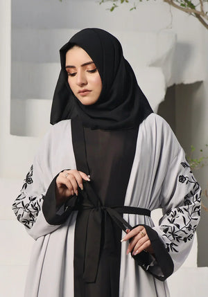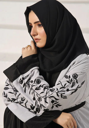 Feeling beautiful and elegant, our grey and black Zenda abaya is the one for you! It has a black inner with a grey upper with embroidery on the sleeves. A cool twist of modern design, this abaya will keep you comfortable and stylish.