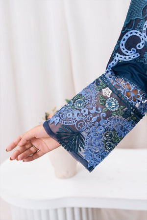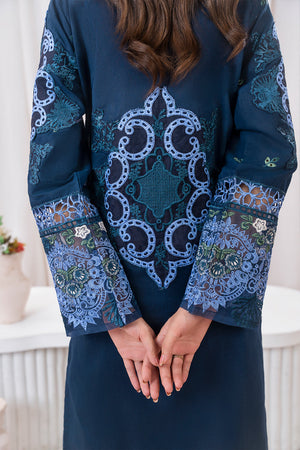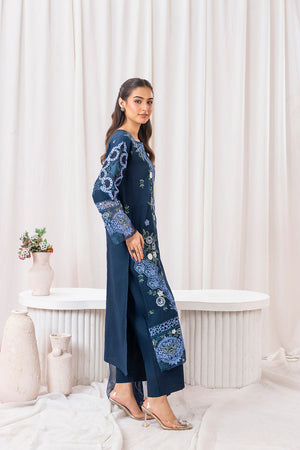 A 3-piece stitched ensemble crafted from premium quality cotton fabric, designed for comfort and festive sophistication. The set includes a long straight shirt adorned with intricate and detailed embroidery on the front and sleeves, paired with a matching embroidered dupatta for a refined traditional look. The outfit is completed with a straight plain trouser, offering a clean and modern silhouette that balances the ornate design of the shirt and dupatta.