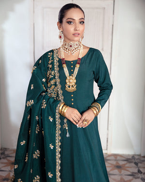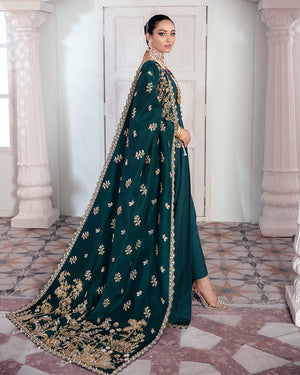 A deep jewelled peacock toned rawsilk shawl with elaborately composed scenic pallu having botanical motifs and contemporary motifs all over the surface furthermore, enhanced with true craftsmanship with different handwork techniques. Paired with panelled kalidaar having dainty handwork detail around hem and sleeves, the shawl is perfect for your intimate wedding coming this season.