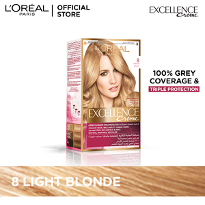 L'Oréal Paris Excellence Crème Hair Color #8 Light Blonde provides 100 percent grey coverage and rich, vibrant color. Its patented Triple Protection System guards against damage, fading and brassiness to help keep your hair looking healthy and salon-fresh for eight weeks.