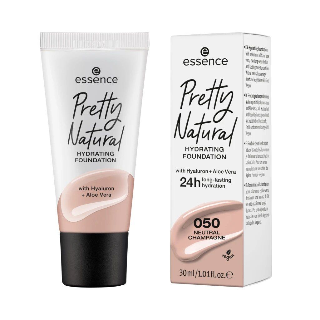Pretty and natural! the essence pretty natural hydrating foundation with hyaluronic acid and aloe vera provides a natural, medium coverage finish and weightless feel for up to 24 hours, leaving you with the perfect combo of pretty and natural. vegan, paraben free, alcohol free, oil free, gluten free.