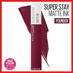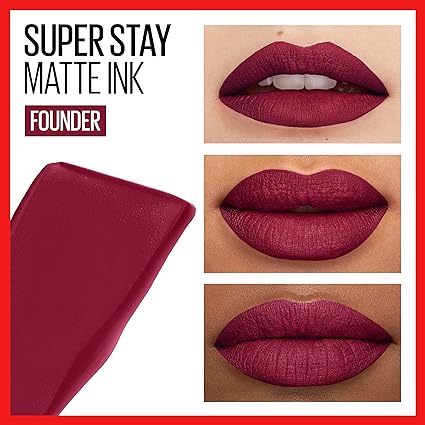 Experience a flawless and long-lasting cranberry red lip color with Maybelline SuperStay Matte Ink in shade Founder. Achieve a perfectly matte finish that lasts up to 16 hours with this highly pigmented liquid lipstick. Its iconic longwear formula ensures no transfer and effortless application with its unique arrow applicator. Try it with Maybelline foundation or BB cream for endless makeup possibilities.