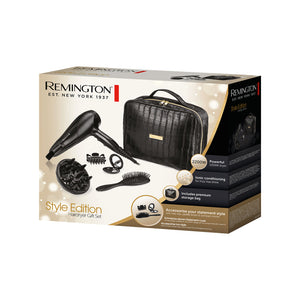 The Style Edition Hairdryer Gift Set D3195GP is a comprehensive hair care package from Remington. It includes a powerful 2200W hairdryer with Ionic Conditioning for a frizz-free blow-dry. The set also comes with a concentrator, diffuser, hair clip, paddle brush, and compact mirror.