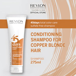 Revlonissimo™ 45 Days Total Color Care cares for the hair while protecting the vibrancy and depth of cold or warm blonde, bright coppers, brunettes/browns and red shades. It replenishes pigments in the hair fiber to compensate for the gradual color loss caused by washing.
