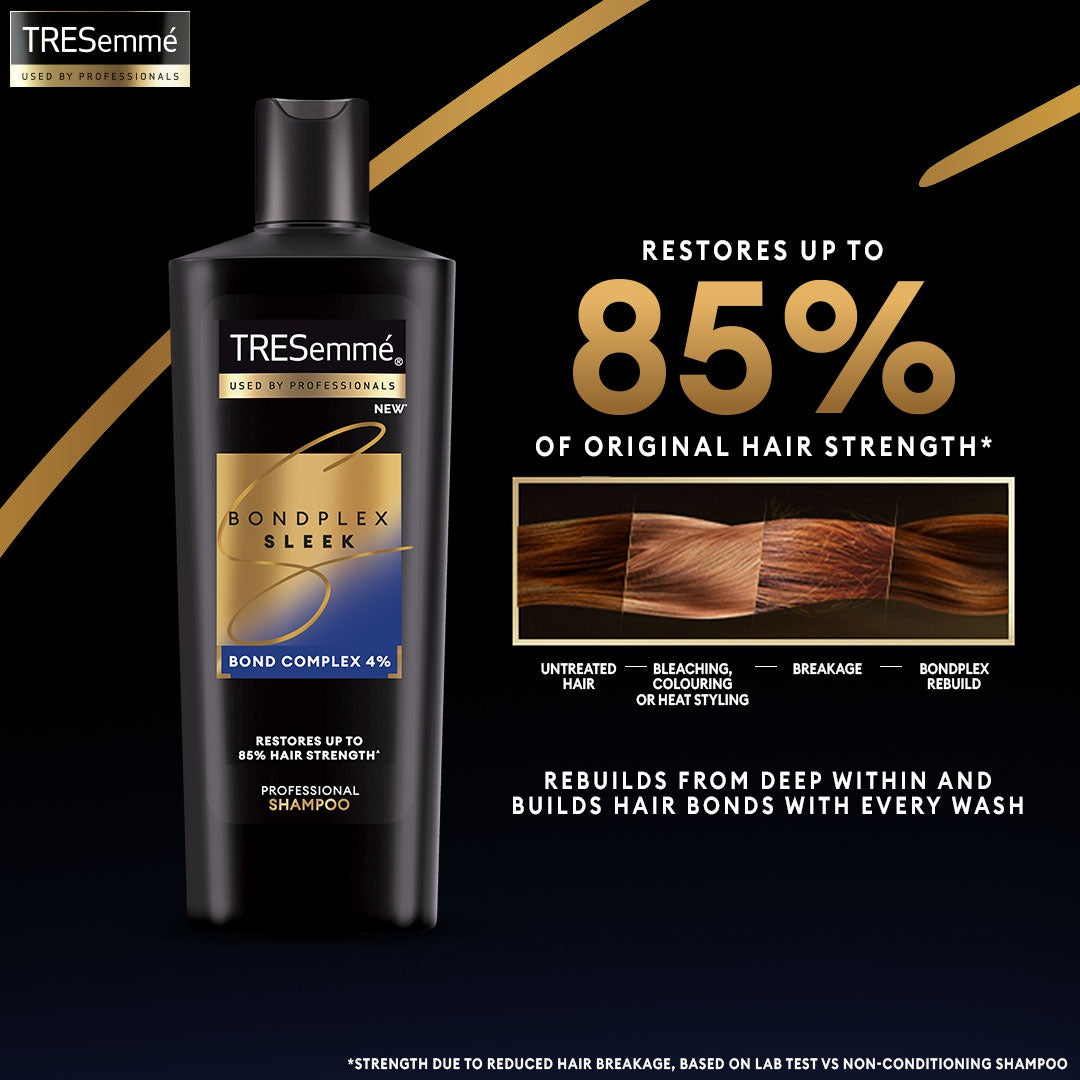 Enriched with a protein bonding complex and up to 6% bonding actives, the TRESemme Bond Plex Sleek Shampoo helps create up to millions of hair bonds to Sleek damaged hair.