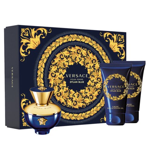 Experience the luxurious scent of Versace Dylan Blue Women Set. This set includes a 50ml Eau de Parfum spray, 50ml shower gel, and 50ml body lotion. Launched in 2017, this floral fruity fragrance features notes of black currant sorbet, granny smith apple, and more. Indulge in the perfect combination of sophistication and freshness.