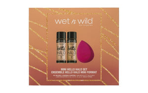 A set of two liquid highlighters and makeup sponge. Up your glow game with wet n wild’s Hello Halo Set. Featuring two buildable liquid highlighters with multi-dimensional shimmer effects and a pointed makeup sponge to buff and blend to perfection. With glistening pearl pigments, the formulas are infused with powerhouse ingredients such as grapeseed oil, and vitamin E to keep your skin looking radiant no matter what. Cruelty free Set Includes: - Mini Mega Glo Liquid Highlighter 12ml - Mini Mega Glo Liquid Highlighter 12ml - Pink Makeup Applicator Sponge