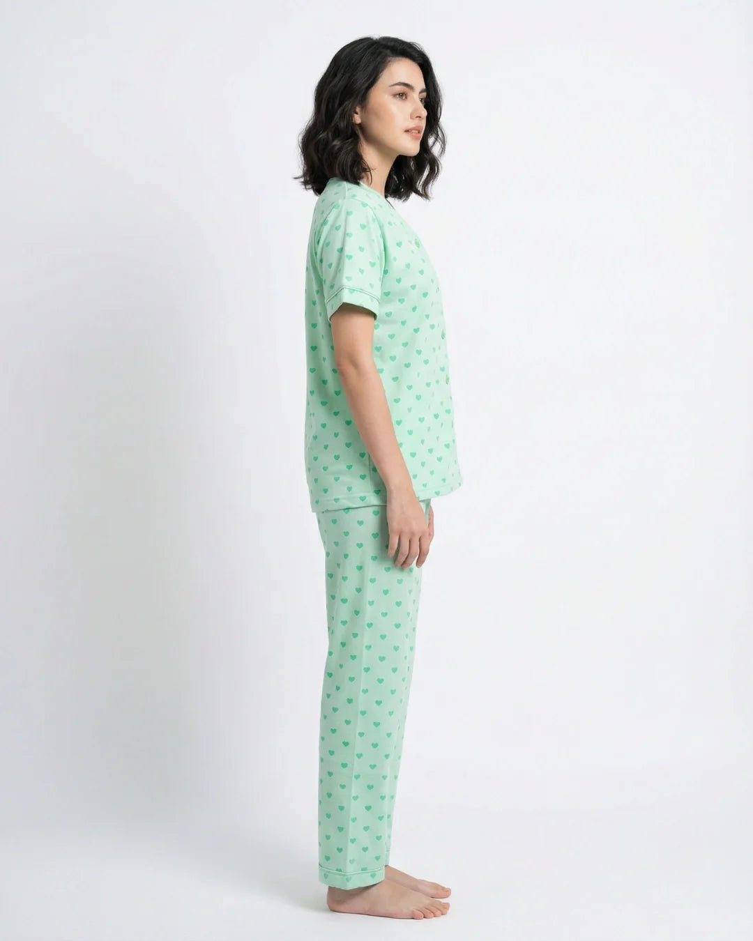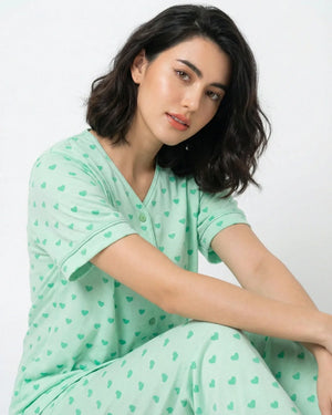Add a playful touch to your sleepwear rotation with this cheerful pajama top from the brand Sajero. The design features a sweet, scattered pattern of darker blue hearts against a bright turquoise background, creating a fun and youthful look. Crafted for comfort, it includes a classic button-down front secured with matching aqua buttons, making it an ideal choice for cozy lounging or a good night's sleep