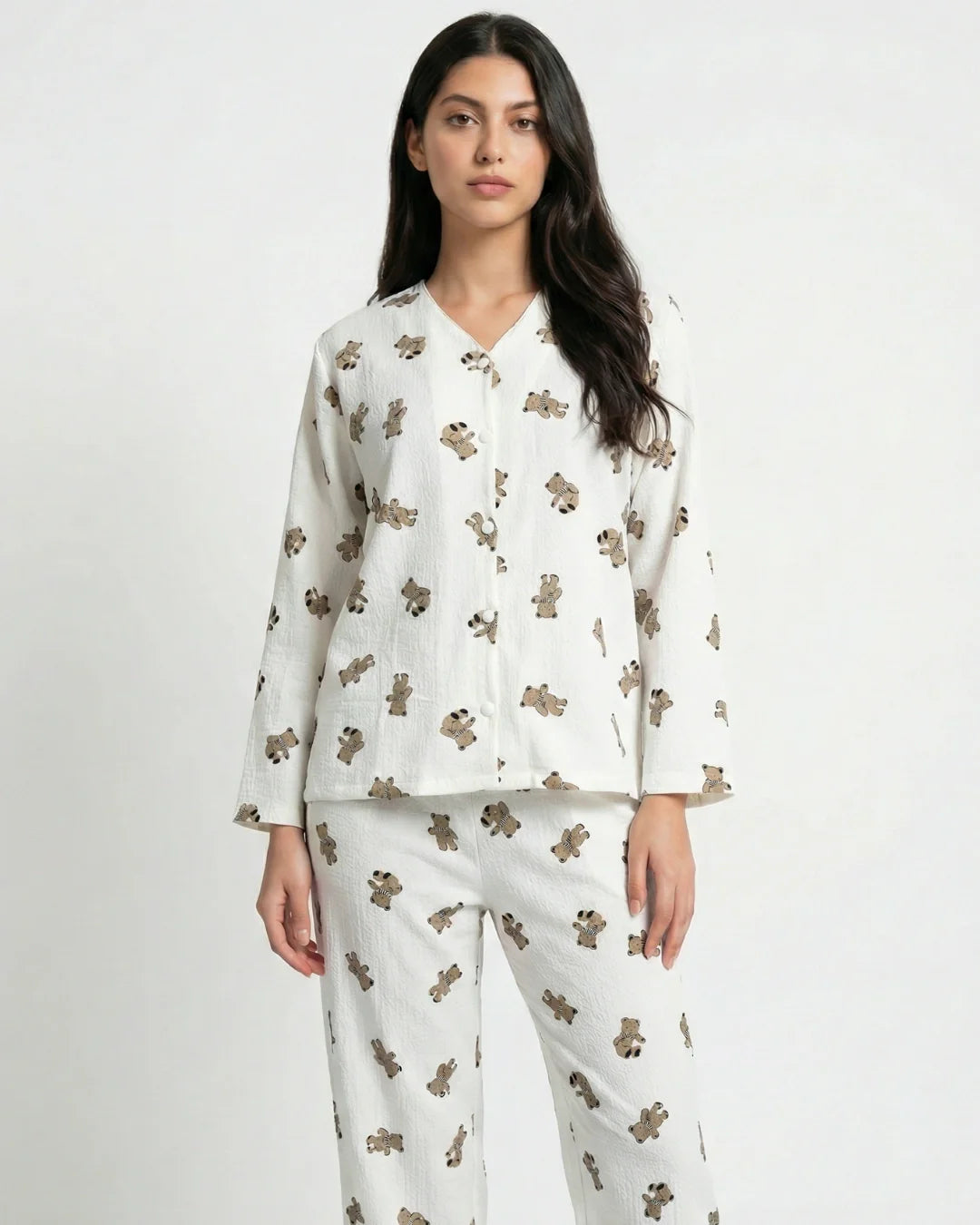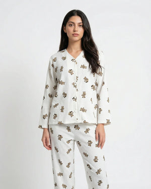 This cozy two-piece nightwear set is perfect for relaxed nights and everyday comfort. Crafted from crinkled cotton, it feels lightweight, breathable, and soft against the skin, making it ideal for restful sleep and lounging. The clean, neutral base with cute teddy-inspired prints and a comfortable button-front top creates a charming yet effortlessly comfortable look.