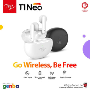 The ITEL EARBUDS Model T1 NEO offer high-quality audio with DSP noise cancellation and 13.4mm Bass Boost Drivers. They feature Bluetooth 5.1 for seamless connectivity and up to 18 hours of playtime with the charging case. Enjoy a comfortable fit and IPX5 water resistance for durability.