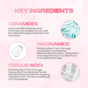 - Protects skin from damage caused by free radicals: Ferulic acid, Niacinamide and Hyaluronic acid are all antioxidants that help to protect the skin from damage caused by free radicals.