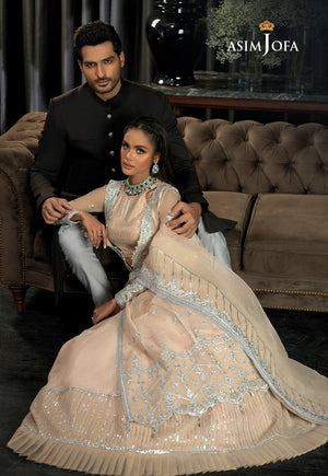 Working her sultry charm Kiran Naz sizzles in this buff colored attire. The over shirt is crafted in a kalidaar ending with heavily worked scalloped border its worn over a shimmery halter crop top which peeks underneath the shirt. Its supported by silk lehnga trimmed with spangled border on its hem. Same hued organza dupatta is worked in painstaking detail with diagonal lines on its sides with heavily sprinkling sequins adding shine. Take out your antique emeralds to complement this exclusive design.