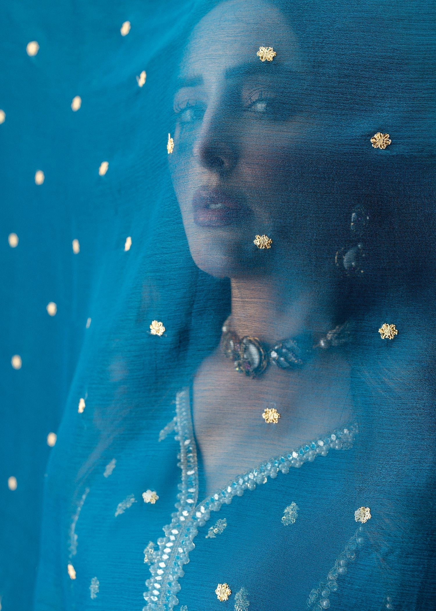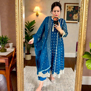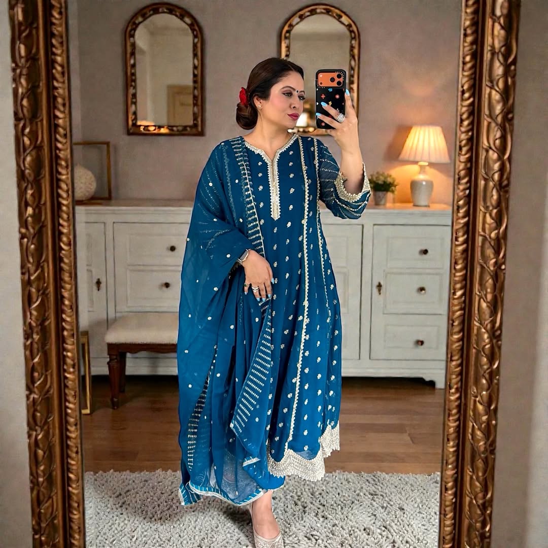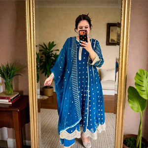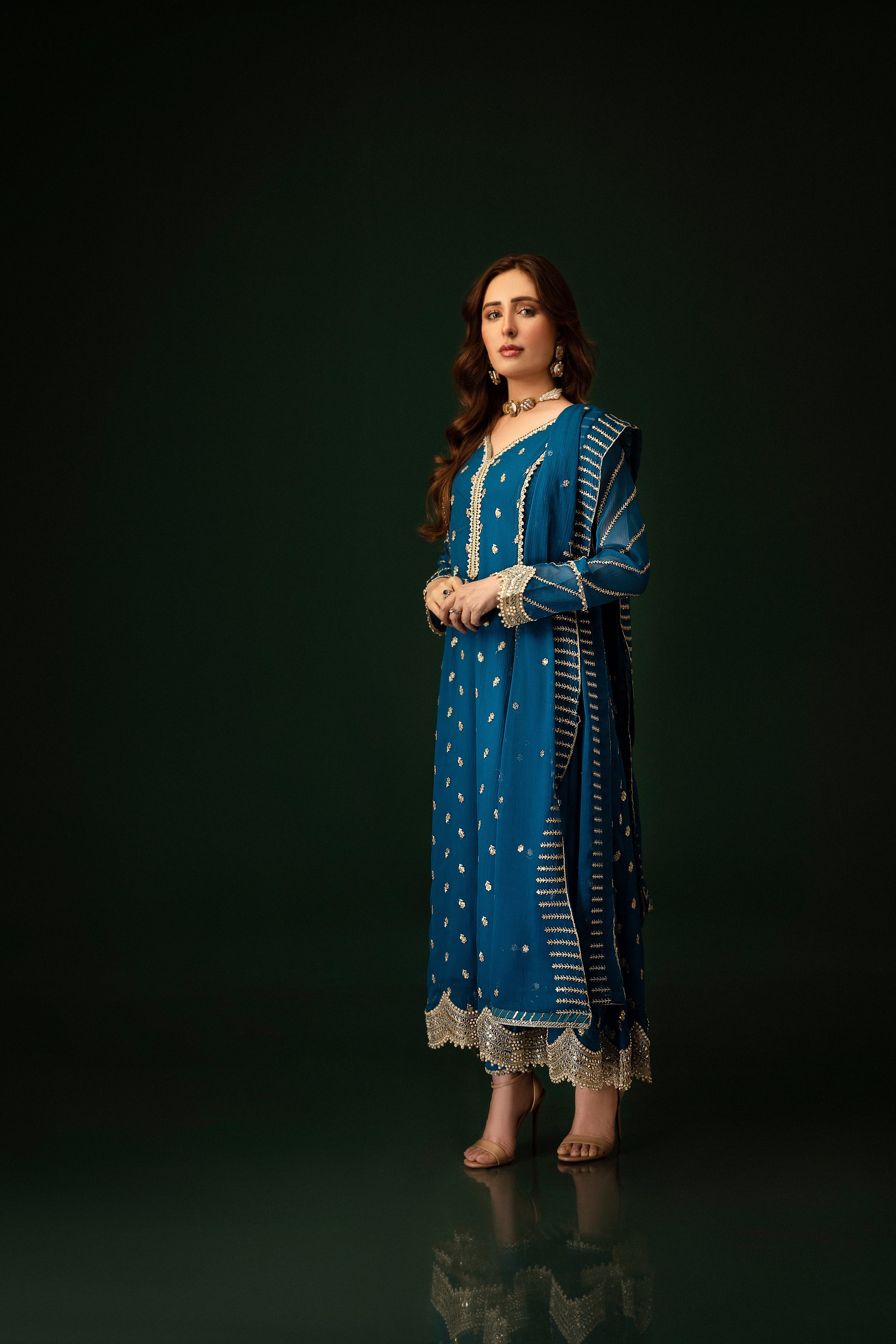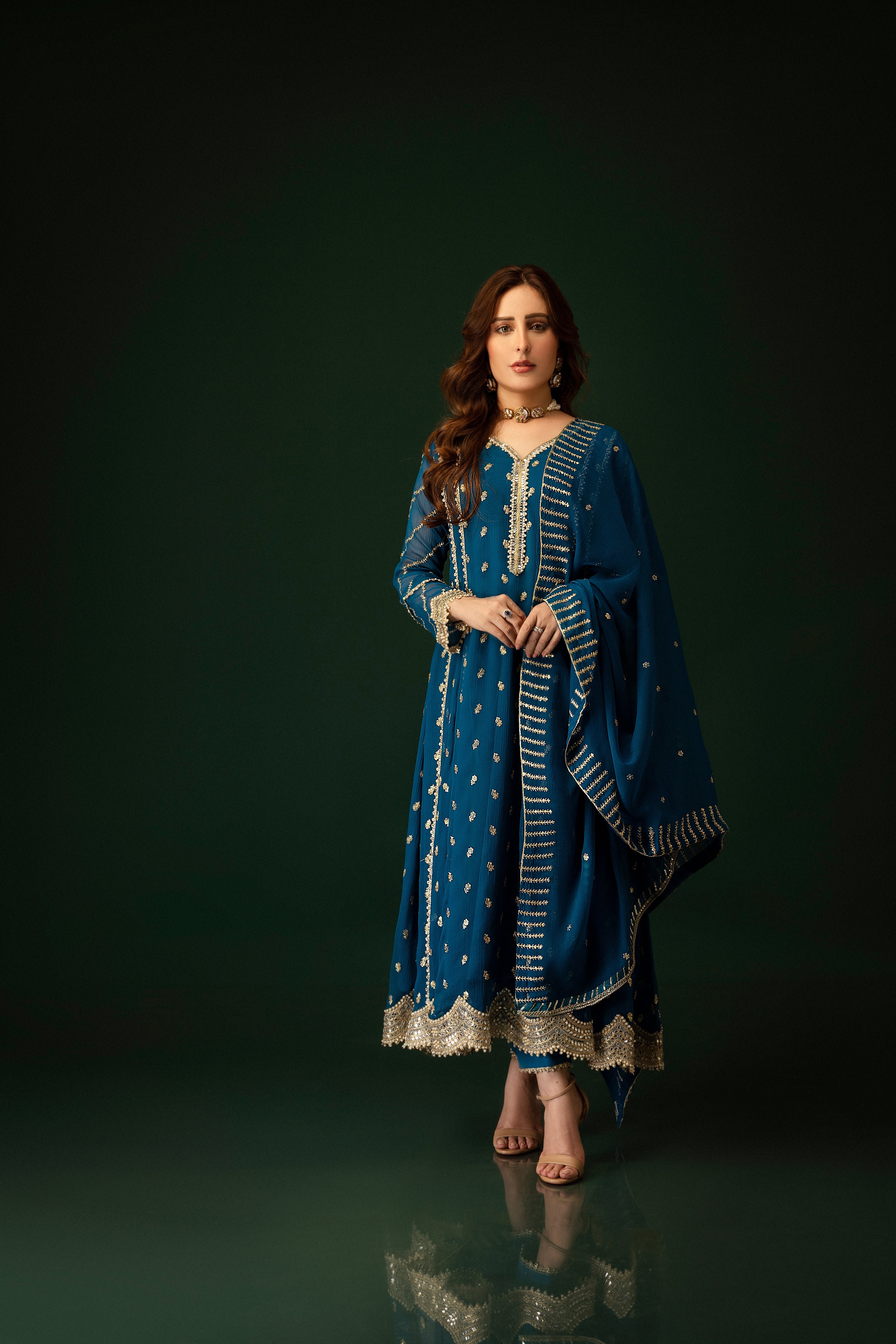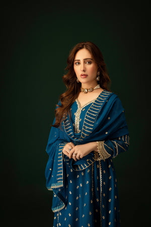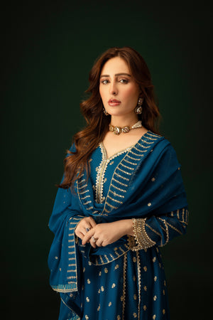 This exquisite Flared Pishwas in Peacock exudes elegance. Crafted from Chiffon with intricate embroidery, this 3-piece outfit includes slim-fit Cigarette Pants and a Chiffon Dupatta. Perfect for festive occasions, the Lining Attached adds to its allure. From Al-Harir Apparel.
