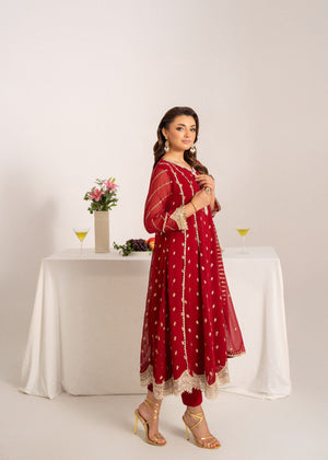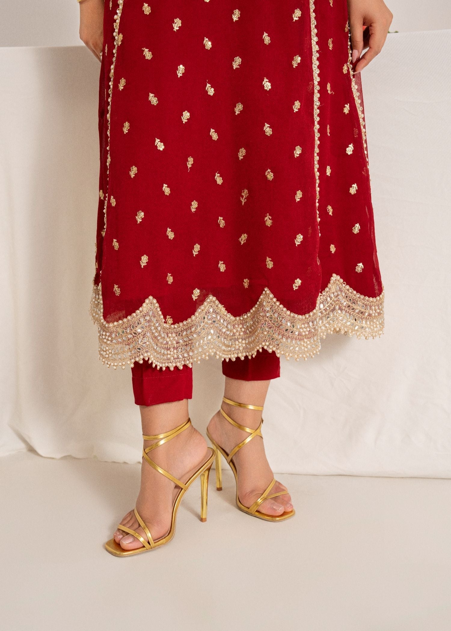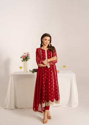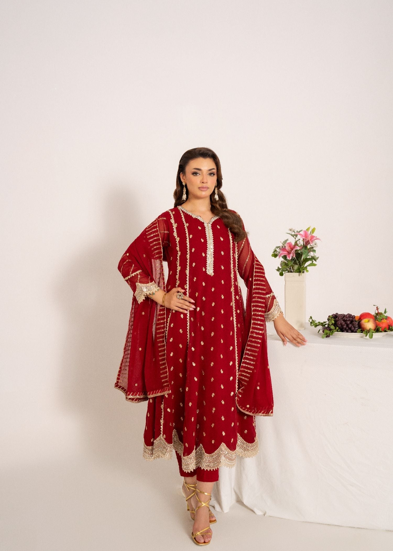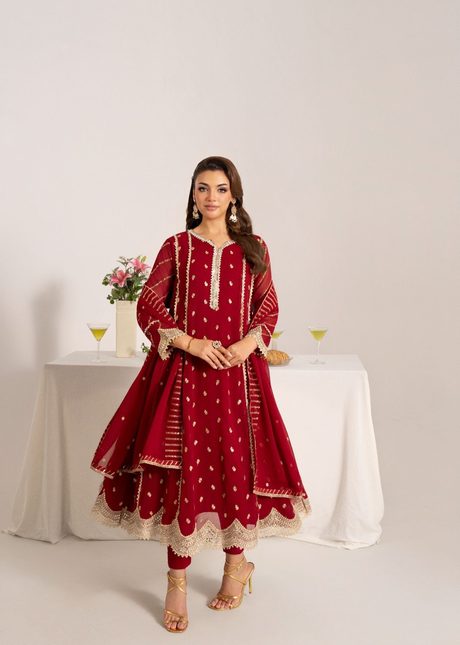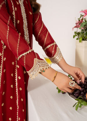 This exquisite Flared Pishwas in rich Maroon exudes elegance. Crafted from Chiffon with intricate embroidery, this 3-piece outfit includes slim-fit Cigarette Pants and a Chiffon Dupatta. Perfect for festive occasions, the Lining Attached adds to its allure. From Al-Harir Apparel.